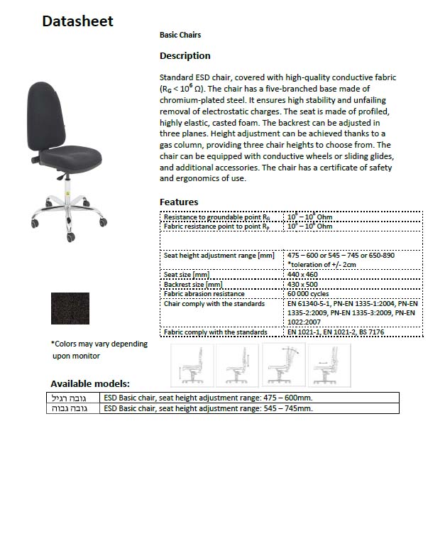 - 50303050 – כסא אנטי סטטי במגוון צבעים מ.בינוני. גובה: 620-485 מ"מ