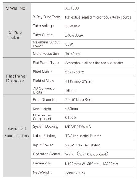 XC1100 – מכונת אוטומטית מלאה של קרני רנטגן עם מיקרו פוקוס המשתמשת בעקרון פרספקטיבה של רנטגן ובתוכנת אלגוריתמים שפותחה באופן עצמאי עם פונקציית AI, שיכולה לחשב במהירות ובדייקנות את מספר החומרים בסליל החומר.