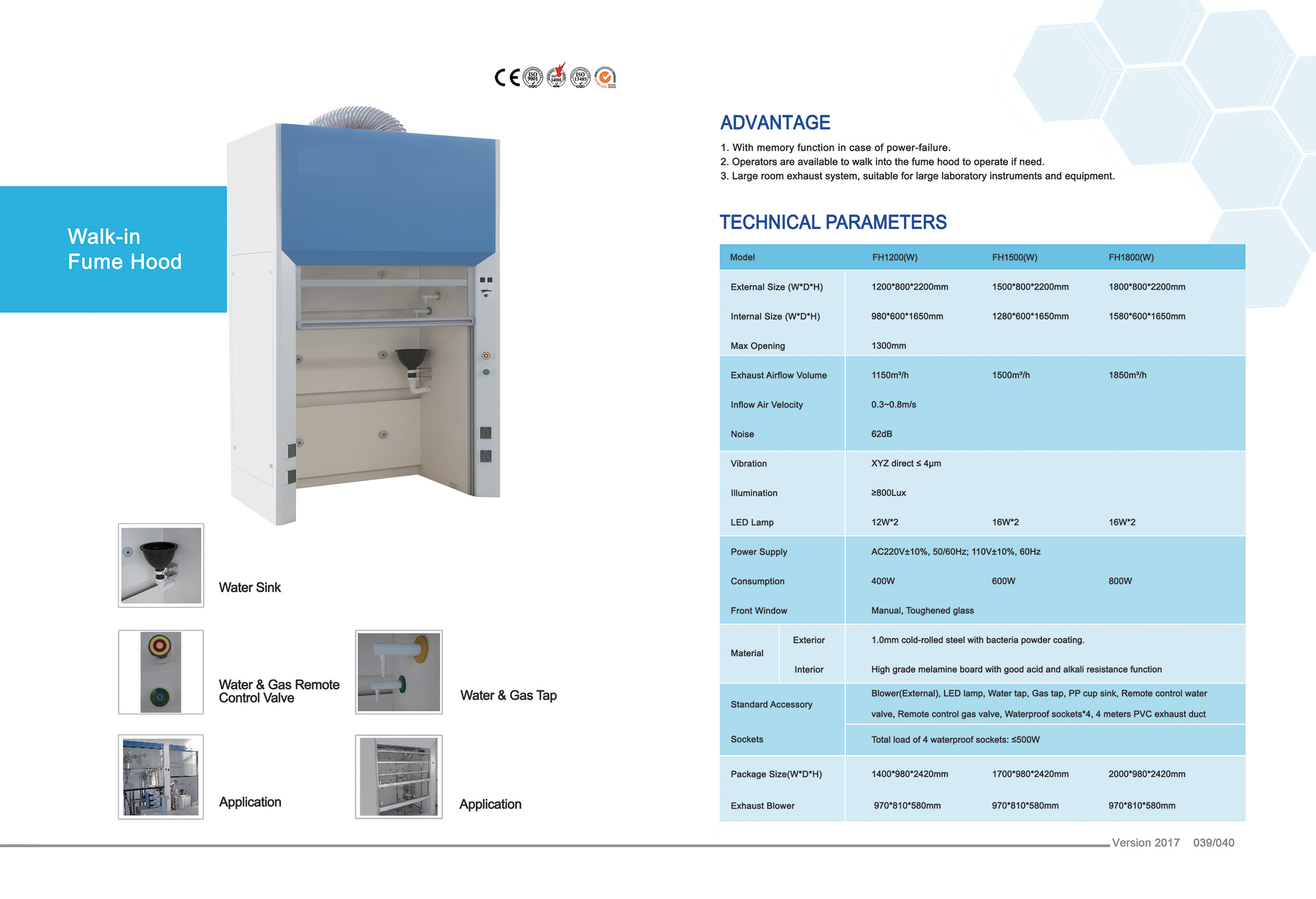 - כולל מפוח חיצוני, מנורת פלורסנט, ברז מים, ברז גז, כיור מים, שסתום מים וגז