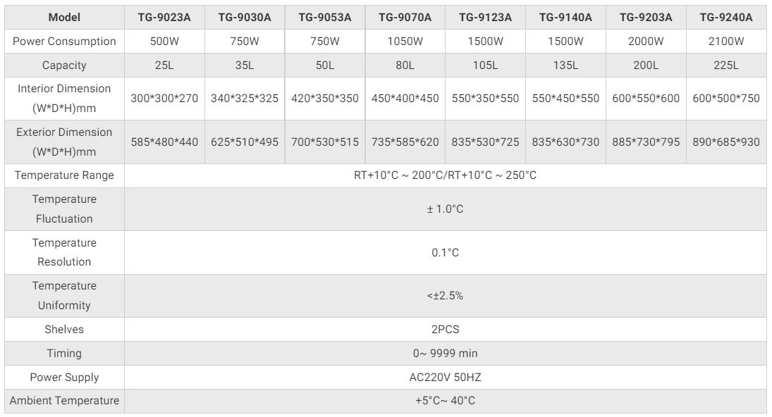 בקרת הטמפרטורה היא RT+10°C~+250°C, הקיבולת נעה בין 25L ל-225L.