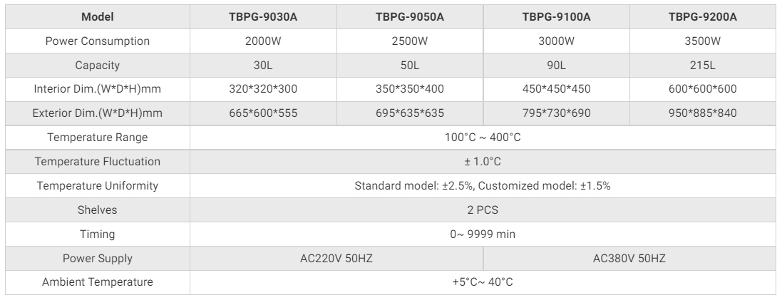 בקרת הטמפרטורה היא 100°C~+400°C, הקיבולת נעה בין 30L ל-215L.